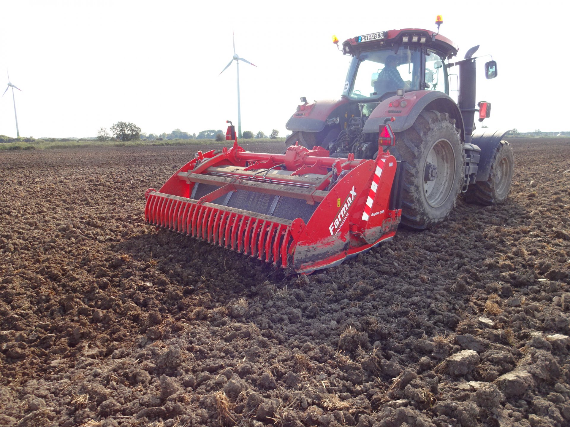 It features 24 shear bolt spade blades, 20mm thick flanges, 15mm thick spade blades and a hydraulically adjustable harrow roller/cutter. The height gauge of the harrow roller, cultivator and ring roller are clearly legible from the tractor. There is also a shield for the harrow roller/milling machine, Farmax catch hooks for a second roller, the Packer roller or cage roller are hydraulically adjustable, there are attachment hooks for seed drills and lighting.